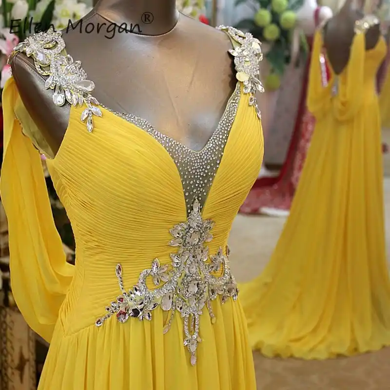 Cristalli Di Lusso Chiffon Giallo Vestiti Da Sera Lungo 2019 Elegante Backless Dell Innamorato Della Piega Una Linea Di Foto Reali Eventi Per Le Donne Abiti Da Sera Aliexpress