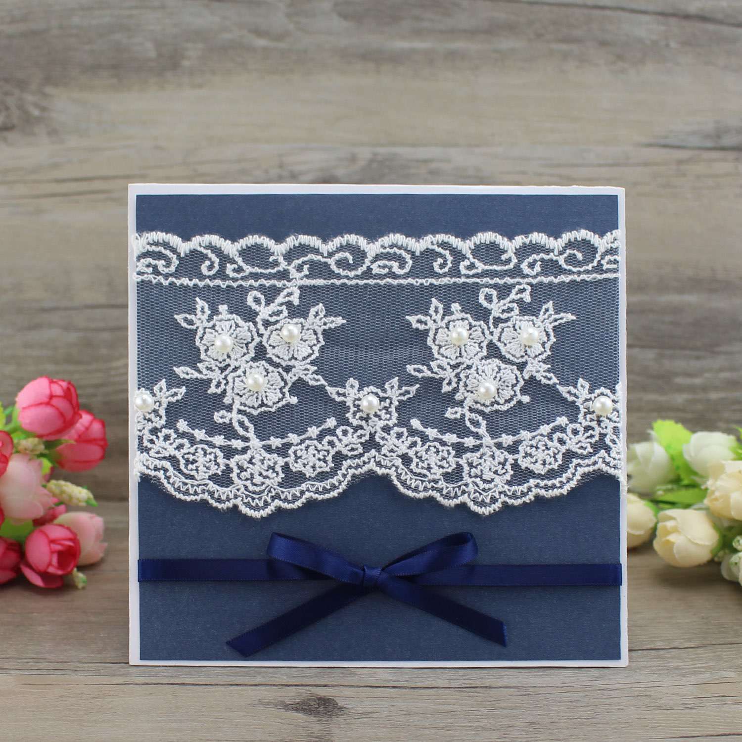 Lace Card Handmade Invitation Dark Blue Wedding Invitation With Ribbon Bow Greeting Card