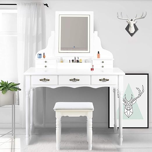 Amazon Com Tocador De Madera Con Luz Led Y Puerto Usb 7 Tiradores Taburete Acolchado Para Nina Y Dama Color Blanco Kitchen Dining
